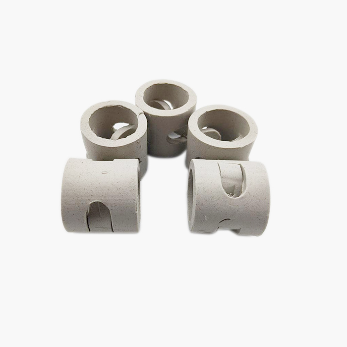 陶瓷鮑爾環(huán)填料是在陶瓷拉西環(huán)的基礎(chǔ)上開發(fā)的一種高徑相等的開孔環(huán)型填料,每層窗孔有5個(gè)舌葉,每個(gè)舌葉內(nèi)彎指向環(huán)心,上下兩層窗孔的位置相反錯(cuò)開,一般開孔面積約占環(huán)壁總面積的30%左右,使得填料塔內(nèi)的氣體和液體能夠從窗孔自由通過,改善了氣液分布,充分利用了環(huán)的內(nèi)表面。