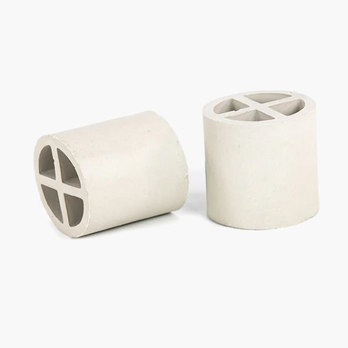 陶瓷十字隔板環(huán)填料是基于增加填料的比表面積,從而強化傳質效率而開發(fā)出來的。 其形狀是在拉西環(huán)中間增設了十字隔板。 一般來講,這種填料由于尺寸較大,僅適用于整體堆徹,目前一般只作為亂堆填料的塔底支撐分布層用。
