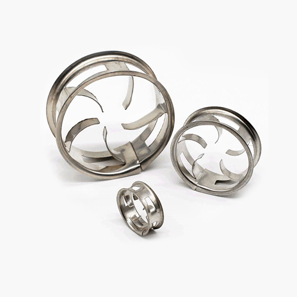 金屬階梯環(huán)填料是一種新型開孔型填料。它的高約為直徑的一半,一邊有錐形翻邊,環(huán)壁上開有窗孔,并有彎曲葉片伸向環(huán)心。由于此些特殊結(jié)構(gòu),改善了填料層內(nèi)氣液分布,增加了氣液接觸點(diǎn),有利于液體匯聚分散及膜表面的不斷更新,使傳質(zhì)得到強(qiáng)化,分離效率大大提高。