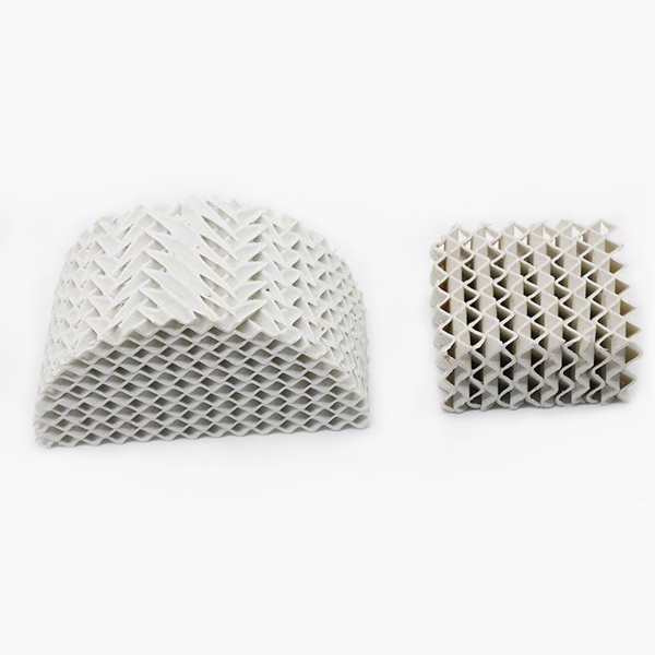 陶瓷波紋填料是一種新型規(guī)整填料,它是由許多具有相同幾何形狀的填料單元體組成。由于陶瓷獨特的結構,具有良好的親水性能,其表面可形成極薄的液膜的湍動及氣流的傾斜曲折通道能促進氣流但又不阻擋氣流使陶瓷填料能與金屬填料相匹敵,而其耐腐蝕、耐高溫性能金屬填料卻無法相比。表面結構有良好的濕潤性能,能使液體加快流動、使填料滯液量降至最低。從而降低了過熱、聚合和結焦的機會。